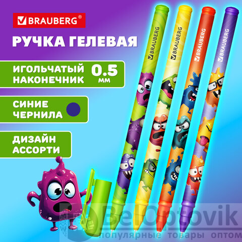 Ручка гелевая, кросс-серия "МОНСТРИКИ", BRAUBERG, СИНЯЯ, корпус ассорти, игольчатый наконечник 0,5 мм, линия письма 0,3 мм,144483