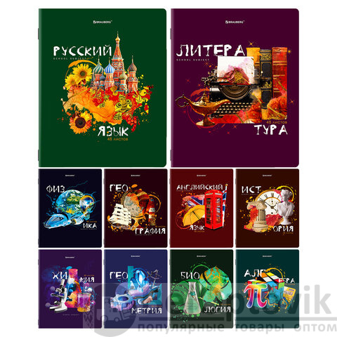 В комплекте 10 тетрадей: Алгебра, Английский язык, Биология, География, Геометрия, История, Физика, Химия, Литература (в линию), Русский язык (в линию). Внутренний блок плотностью 60 г/м2. Белая бумага 100% белизны с красными полями. 48 листов. Формат А5. На скрепке. Прямые углы. Длина: 205 мм. Ширина: 165 мм. Артикул производителя: 404328.