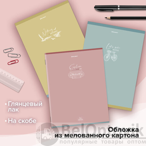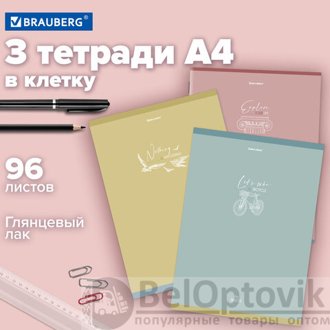 Тетради КОМПЛЕКТ 3 шт. А4, 96 л., BRAUBERG скоба, клетка, глянцевый лак, "Pastel", 404388