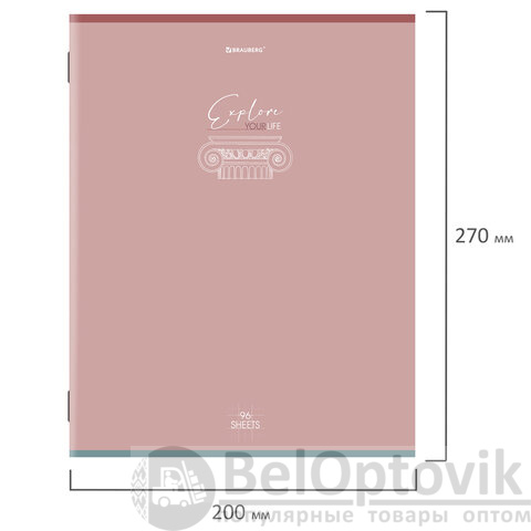 Внутренний блок содержит 96 листов офсетной бумаги плотностью 60 г/м2. Обложка изготовлена из мелованного картона с глянцевой ламинацией. Линовка - клетка. Скоба надежно скрепляет листы между собой. Белизна – 100%. Формат А4.
