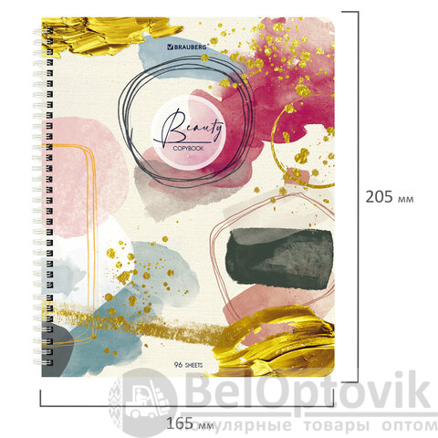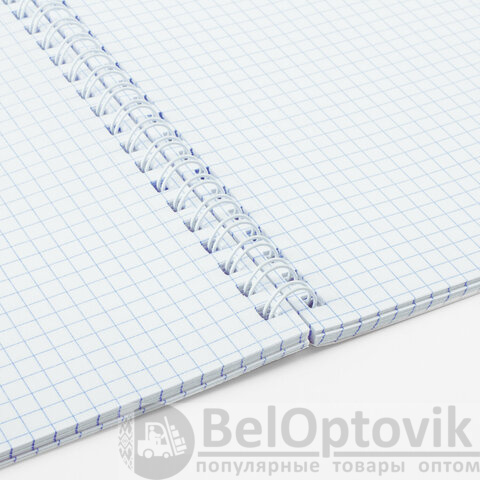 Внутренний блок содержит 96 листов офсетной бумаги плотностью 60 г/м2. Обложка изготовлена из мелованного картона и покрыта глянцевым лаком. Линовка – клетка. Гребень надежно скрепляет листы между собой. Белизна – 100%. Формат А5.