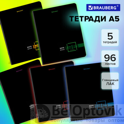 Тетради ДЭК А5 96 л. КОМПЛЕКТ 5 шт., BRAUBERG скоба, клетка, глянцевый лак, "Dark", 404694