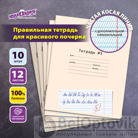 Тетради ДЭК 12 л. КОМПЛЕКТ 10 шт. ПРОПИСЬ № 1 частая косая линия С ДОПОЛНИТЕЛЬНОЙ ГОРИЗОНТАЛЬНОЙ, со справочным материалом, ЮНЛАНДИЯ, 404860