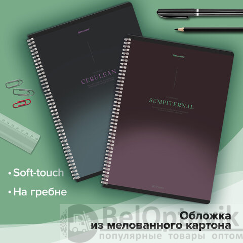 Внутренний блок содержит 96 листов офсетной бумаги плотностью 60 г/м2. Обложка изготовлена из мелованного картона с ламинацией Soft Touch. Линовка – клетка. Гребень надежно скрепляет листы между собой. Белизна – 100%. Формат А4.