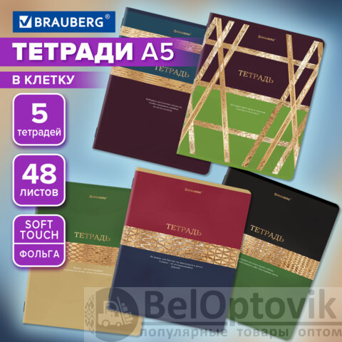 Тетради ДЭК А5 48 л. КОМПЛЕКТ 5 шт. BRAUBERG скоба, клетка, SoftTouch, фольга, GOLDY, 404925