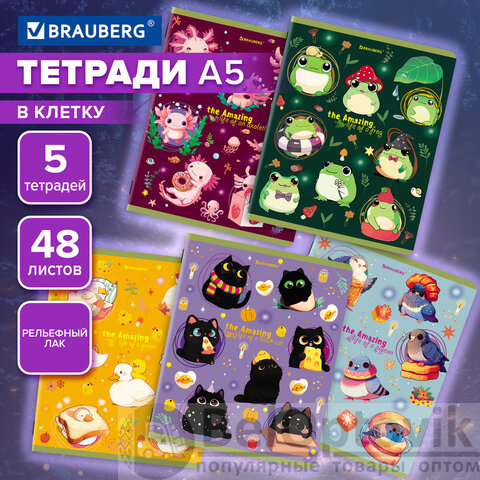 Тетради ДЭК А5 48 л. КОМПЛЕКТ 5 шт. BRAUBERG, скоба, клетка, TWIN-лак, "AMAZING ANIMALS", 404942