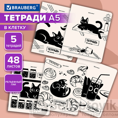 Тетради ДЭК А5 48 л. КОМПЛЕКТ 5 шт. BRAUBERG, скоба, клетка, TWIN-лак, "КОТ-НЕПОСЕДА", 404943