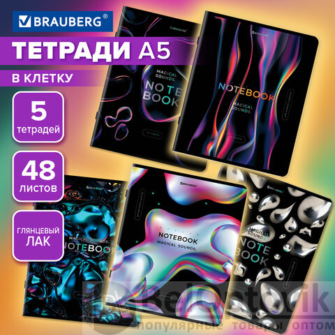 Тетради ДЭК А5 48 л. КОМПЛЕКТ 5 шт. BRAUBERG, скоба, клетка, глянцевый лак, "MAGICAL", 404944
