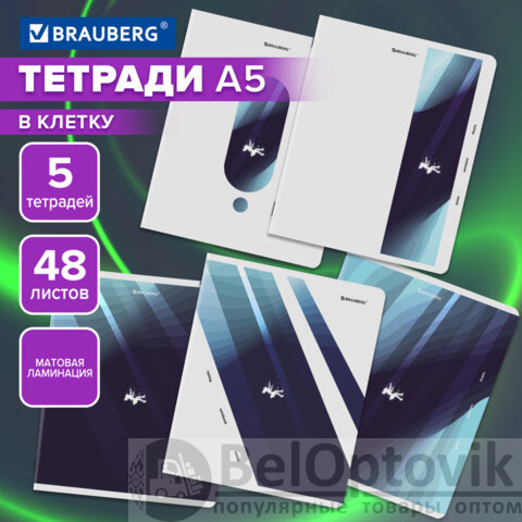 Тетради ДЭК А5 48 л. КОМПЛЕКТ 5 шт. BRAUBERG скоба, клетка, матовая ламинация, ENDLESS, 404952