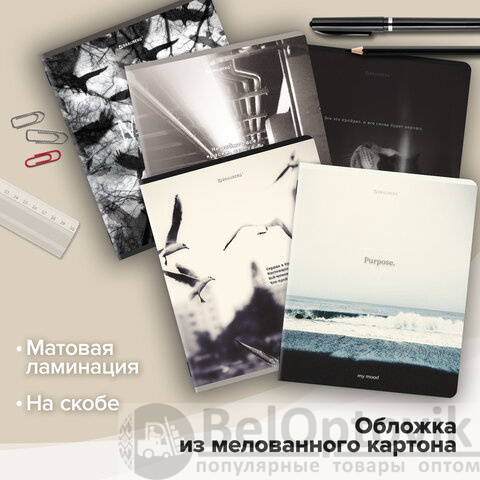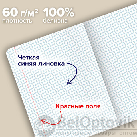 Внутренний блок содержит 48 листов офсетной бумаги плотностью 60 г/м2. Обложка изготовлена из мелованного картона с матовой ламинацией. Линовка – клетка с полями. Скрепка надежно соединяет листы между собой. Белизна – 100%. Формат – А5.