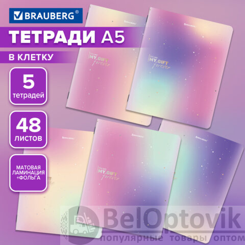 Тетради ДЭК А5 48 л. КОМПЛЕКТ 5 шт. BRAUBERG, скоба, клетка, матовая ламинация, фольга, "SHINE", 404962