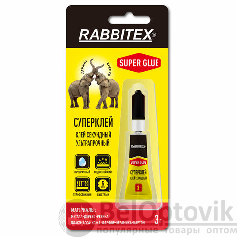 Клей секундный суперклей УЛЬТРАПРОЧНЫЙ, блистер, 3 грамма, RABBITEX (РАББИТЕКС) "ДВА СЛОНА", 609811