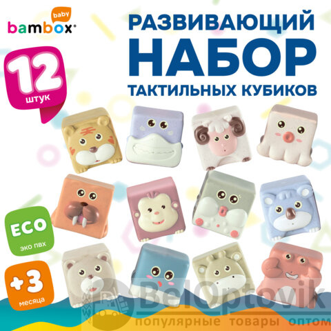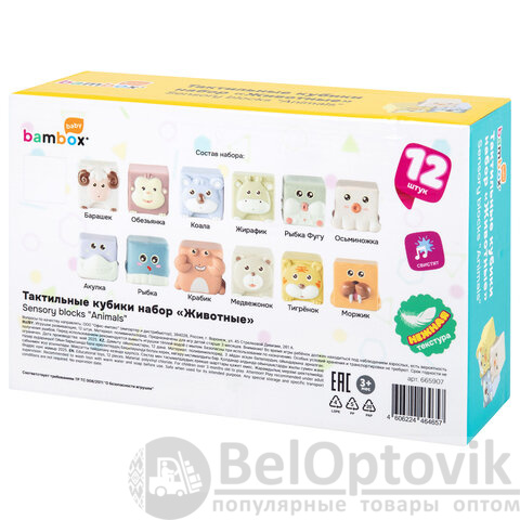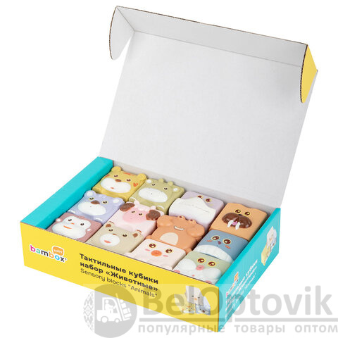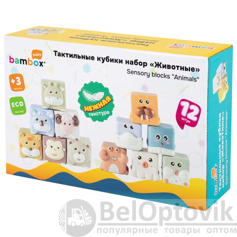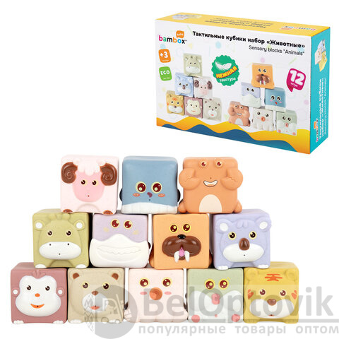 Тактильные кубики "Животные", сенсорные игрушки развивающие, ЭКО, 12 штук, BAMBOX BABY (БАМБОКС БЭБИ), 665907