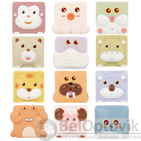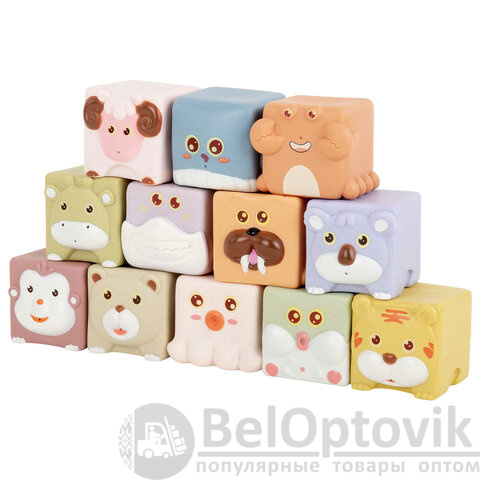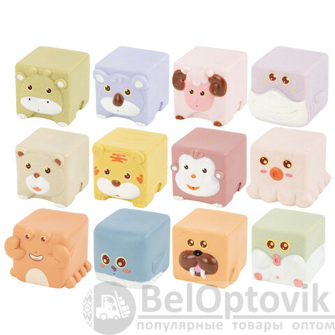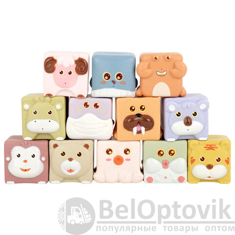 В наборе 12 тактильных кубиков с изображением животных: барашек, обезьянка, коала, жирафик, рыбка фугу, осьминожка, акулка, рыбка, крабик, медвежонок, тигрёнок, моржик. Изделия полые внутри.