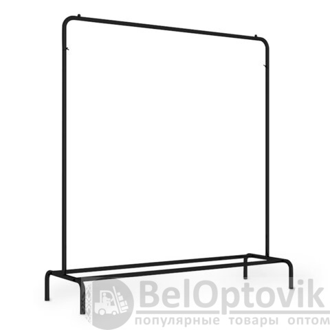 Железная перекладина вмещает до 18 плечиков, распределенная нагрузка – до 30 кг. Перекладина оснащена ограничителями, предотвращающими соскальзывание плечиков. Внизу полка для размещения обуви, коробок или органайзеров. На ножках предусмотрены заглушки, защищающие пол от повреждений. Мобильная благодаря минимальному весу.