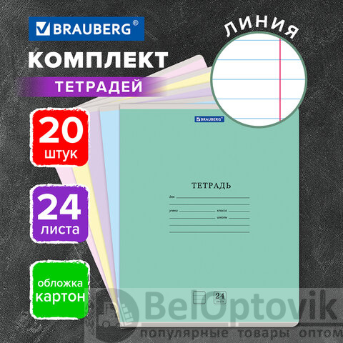 Тетради ДЭК 24 л. КОМПЛЕКТ 20 шт. BRAUBERG "КЛАССИКА NEW", линия, обложка картон, АССОРТИ (5 видов), 880066