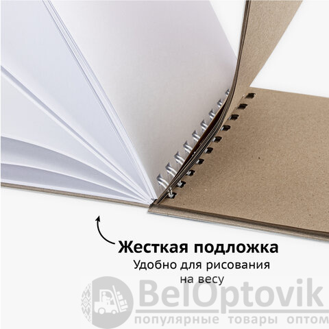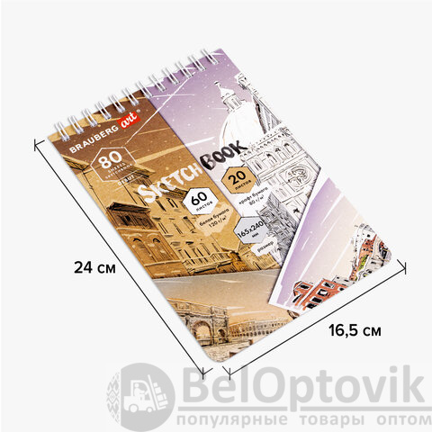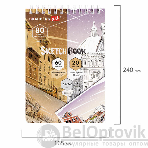 Привлекательная обложка выполнена из твердого переплетного картона. В скетчбуке 60 листов белой бумаги плотностью 120 г/м2 и 20 листов крафт-бумаги плотностью 80 г/м2, т.е. 80 возможностей воплотить свою задумку! Листы удобно скреплены спиралью - это позволяет переворачивать их на 180 градусов. Задняя подложка жесткая, что позволит делать зарисовки и наброски "на весу". Удобный формат размером 165х240 мм.