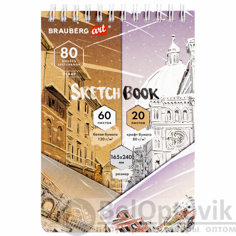 Скетчбук, белая бумага 120 г/м2 + крафт 80 г/м2 165х240 мм, 60 + 20 л., гребень, BRAUBERG ART DEBUT, 112982