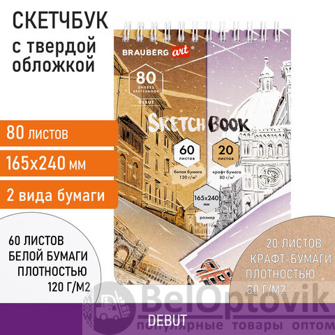 Скетчбук BRAUBERG ART "DEBUT" для эскизов и графики. Внутренний блок ассорти - бумага белого цвета и крафт-бумага. Подходит для работы с широким спектром графических материалов (уголь, соусы, карандаши и прочие).