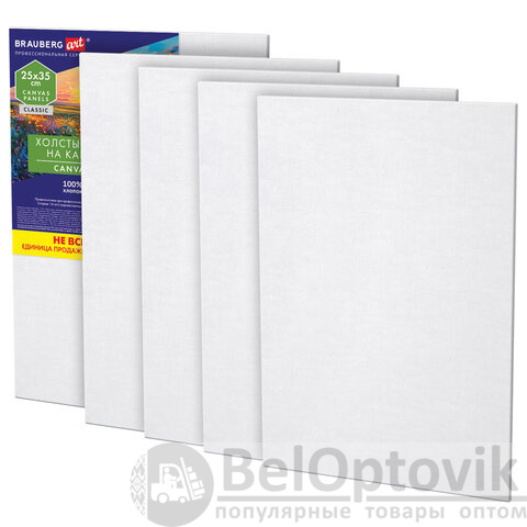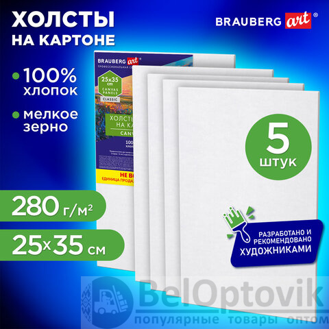 Холсты на картоне НАБОР 5 штук (25х35 см), хлопок, 280 г/м2, грунт, BRAUBERG ART CLASSIC, 192653