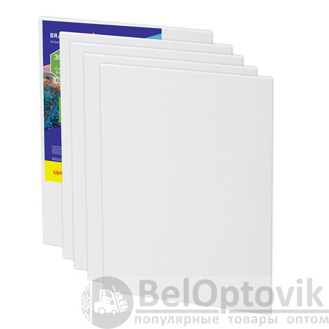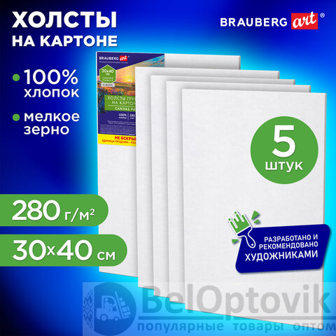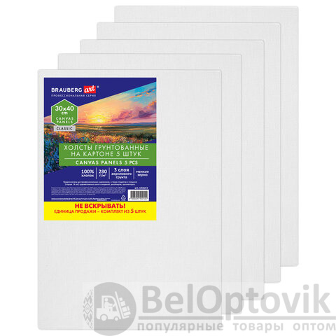 Холсты на картоне НАБОР 5 штук (30х40 см), хлопок, 280 г/м2, грунт, BRAUBERG ART CLASSIC, 192654
