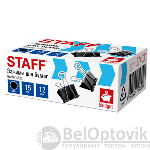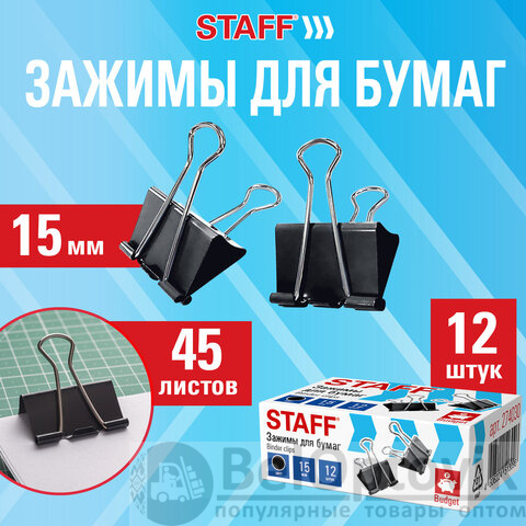 Зажимы для бумаг STAFF ECO, КОМПЛЕКТ 12 шт., 15 мм, на 45 листов, черные, картонная коробка, 274030