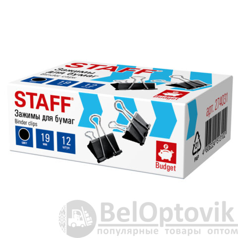 Зажимы для бумаг STAFF ECO, КОМПЛЕКТ 12 шт., 19 мм, на 60 листов, черные, картонная коробка, 274031