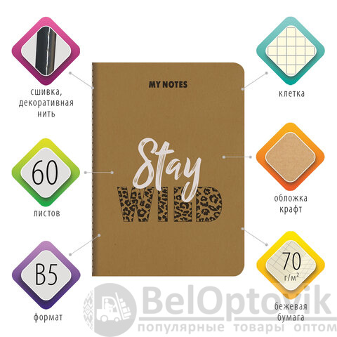Общая тетрадь формата В5 содержит 60 листов с линовкой в клетку. Сшивка плотно соединяет листы. Обложка изготовлена из высококачественного импортного крафт-картона с двусторонней запечаткой, что придает тетради изысканный и неповторимый стиль. Внутренний блок - тонированная офсетная бумага цвета слоновой кости плотностью 70 г/м2.