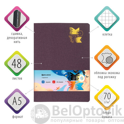 Общая тетрадь формата А5 (147х210 мм) содержит 48 листов с линовкой в клетку. Сшивка плотно соединяет листы. Обложка изготовлена из высококачественного и износоустойчивого материала - экокожи с текстурой под "рогожку" бордового цвета, что придает тетради изысканный и неповторимый стиль. Внутренний блок - белая офсетная бумага плотностью 70 г/м2.