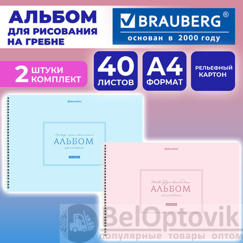 Альбомы для рисования ДЭК, А4, 40 л., КОМПЛЕКТ 2 шт., гребень, рельефный картон, BRAUBERG, 200х290 мм, "Однотонные", 107745