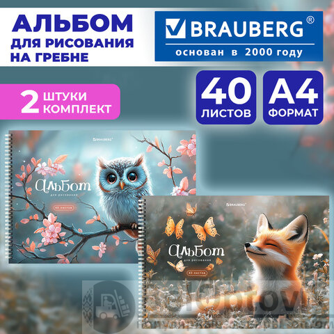 Альбомы для рисования ДЭК, А4, 40 л., КОМПЛЕКТ 2 шт., гребень, обложка картон, BRAUBERG, 200х290 мм, "Лесные друзья", 107746