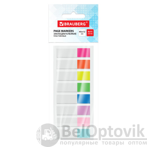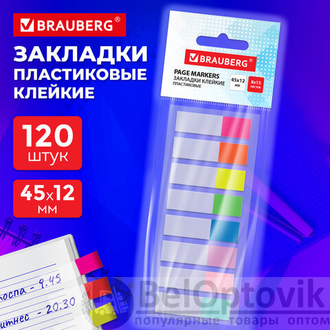 Закладки клейкие прозрачно-цветные BRAUBERG, 45х12 мм, 120 штук (8 цветов х 15 листов), 116675