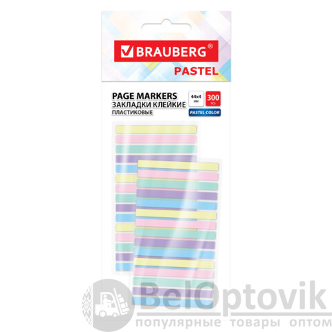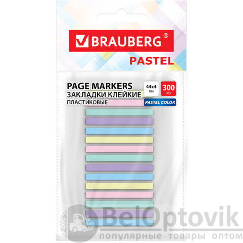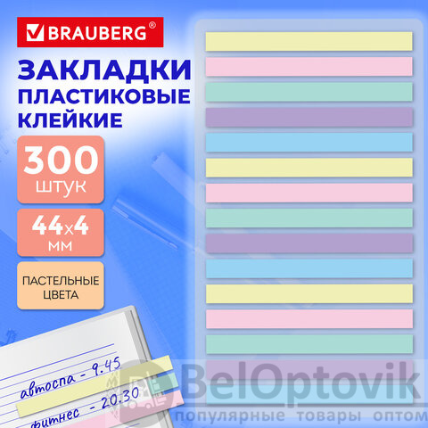 Закладки клейкие пастельные BRAUBERG PASTEL, 44х4 мм, 300 штук (15 блоков х 20 листов), 116683