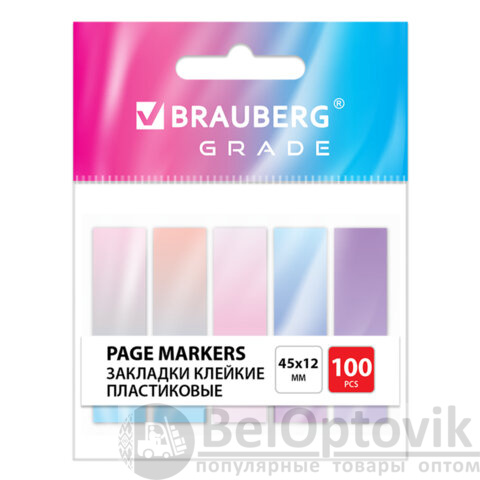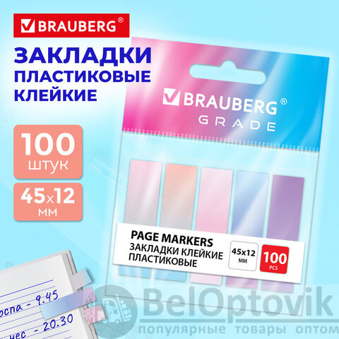 Закладки клейкие пастельные BRAUBERG GRADE 45х12 мм, 100 штук (5 цветов х 20 листов), 116688