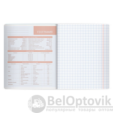 Тетрадь по географии формата А5 с двойной обложкой: внешняя выполнена из высококачественного износостойкого прозрачного пластика, внутренняя – из качественной офсетной бумаги. Преимущество таких тетрадей заключается в том, что для сохранения внешнего вида не нужно покупать дополнительную обложку. На подкладных листах содержится справочный материал по предмету. Внутренний блок плотностью 60 г/м2 из офсетной бумаги содержит 48 листов в клетку с полями. Белизна блока - 100%. Скрепка надежно соединяет листы между собой.