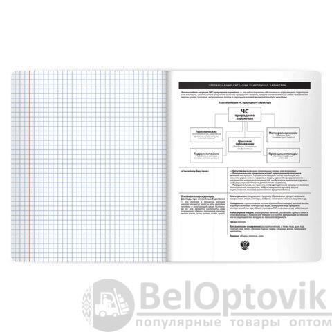 Тетрадь по ОБЗР формата А5 с двойной обложкой: внешняя выполнена из высококачественного износостойкого черного пластика, внутренняя – из качественной офсетной бумаги. Преимущество таких тетрадей заключается в том, что для сохранения внешнего вида не нужно покупать дополнительную обложку. На подкладных листах содержится справочный материал по предмету. Внутренний блок плотностью 60 г/м2 из офсетной бумаги содержит 48 листов в клетку с полями. Белизна блока - 100%. Скрепка надежно соединяет листы между собой.