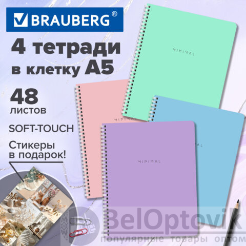 Тетради ДЭК А5 48 л. КОМПЛЕКТ 4 шт., BRAUBERG, гребень, клетка, 80 г/м2, SoftTouch, Minimal, 405579