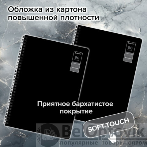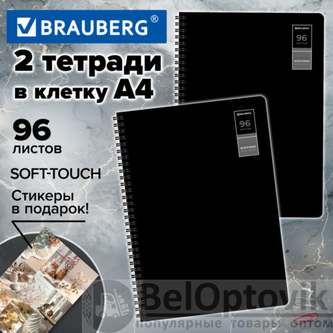 Тетради ДЭК А4 96 л. КОМПЛЕКТ 2 шт., BRAUBERG, гребень, клетка, 80 г/м2, SoftTouch, "Black Classic", 405584