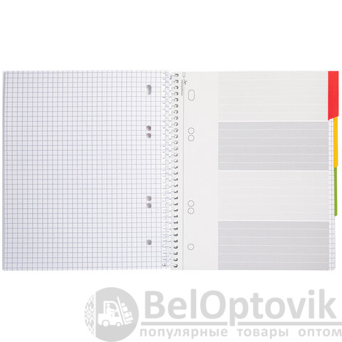 Тетрадь А5 формата 120 листов. Обложка: твердая, ламинированная пленкой Soft-touch картон. Внутренний блок: офсет 60 гр., серая клетка, многоуровневая перфорация, 4 цветных разделителя. Скрепление: спираль. Разноцветные картонные разделители внутреннего блока помогут разбить информацию на 5 тематических разделов. Внутренний блок имеет микроперфорацию на отрыв и универсальную перфорацию для подшивки листов в папку. Скрепление 'спираль' позволяет раскрывать тетрадь на 360 градусов.