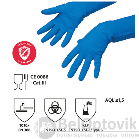 Повышенная химическая защита при работе с моющими и химией – KLP - Type B (EN ISO 374-1:2016+A1: 2018)., защищают от механических повреждений – 1010Х (EN 388:2016+A1: 2018), защищают от бактерий, возбудителей грибковых заболеваний и вирусов.