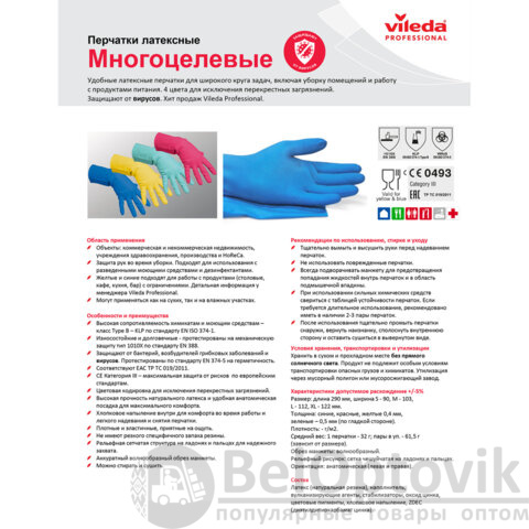 Удобные латексные перчатки VILEDA для широкого круга задач, включая уборку помещений и работу с продуктами питания. 4 цвета для исключения перекрестных загрязнений. Защищают от вирусов. Хит продаж VILEDA Professional.