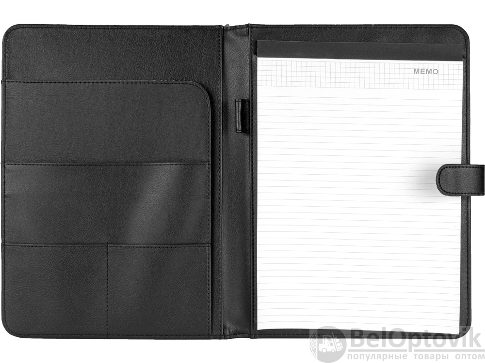 Строгая деловая папка для документов прекрасно подойдет для классического офисного стиля. Карманы для документов и визиток, сменный блокнот, держатель для ручки. Кнопочная застежка. Плотная обложка из кожзаменителя. Возможна персонализация: тиснение или шильд.