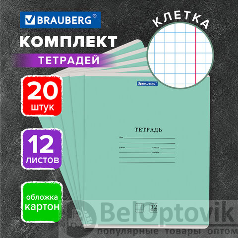 Тетради ДЭК 12 л. КОМПЛЕКТ 20 шт. BRAUBERG "КЛАССИКА NEW", клетка, обложка картон, ЗЕЛЕНАЯ, 880048