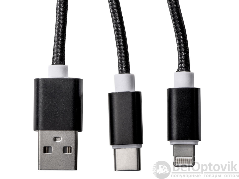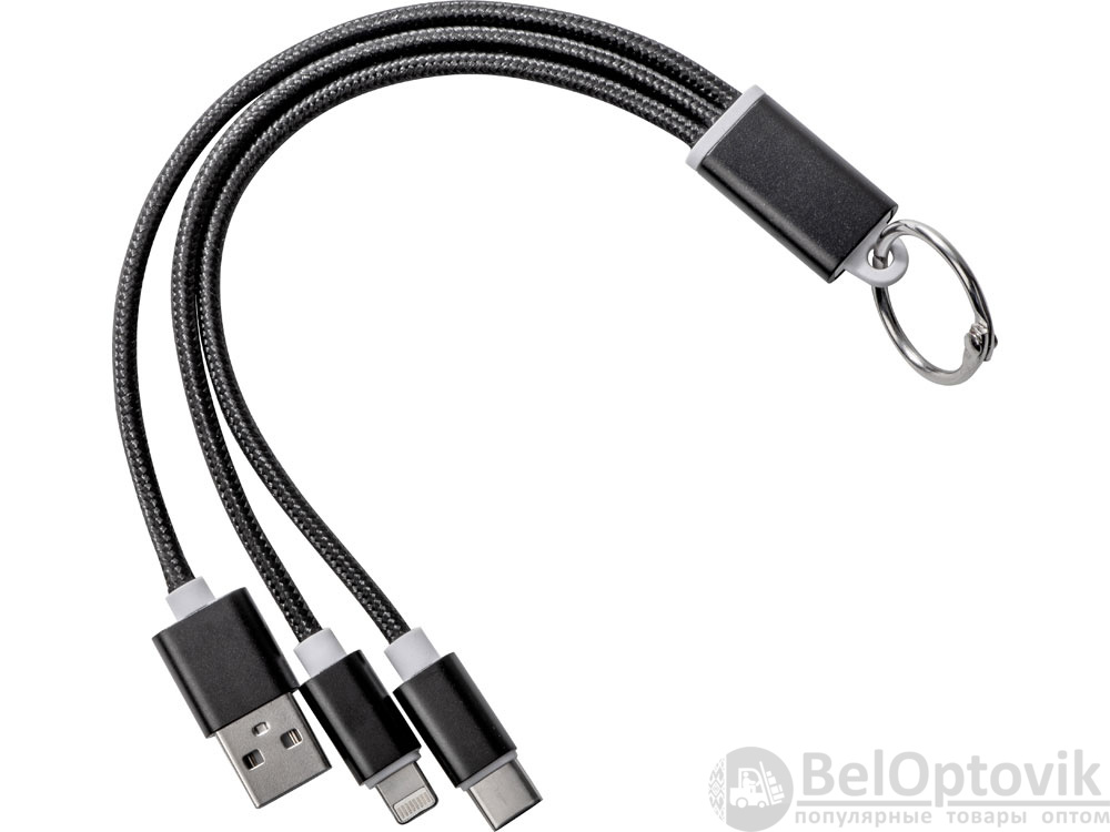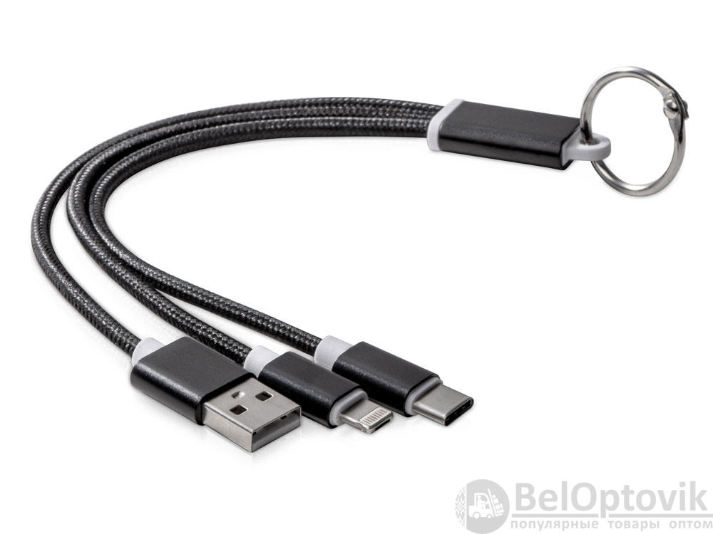 Кабель для зарядки «Tres» 3-в-1 с брелоком, коннекторами 1 type с, 1 USB type A и двойным совместимым коннектором «2-в-1» для устройств с ОС Apple® iOS и Android. В комплект входит брелок. Для зарядки устройств Apple подключайте кабель стороной без контактов; для зарядки устройств с ОС Android подключайте кабель стороной с контактами. Алюминий.
