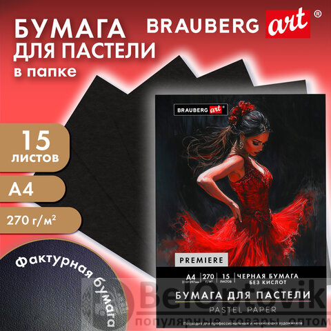 Бумага для пастели ФАКТУРНАЯ, А4, в папке, 15 листов, ЧЕРНАЯ, 270 г/м2, BRAUBERG ART, 117757