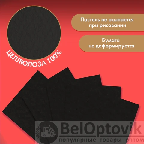 Окрашенная в массе бумага чёрного цвета высокой плотности 270 г/м2 гарантирует превосходное сохранение работ. Еще одним преимуществом является наличие рельефной фактуры, что немаловажно для создания рисунка пастелью. Бумага упакована в картонную папку с ярким рисунком. Папка позволит сохранить ваши рисунки во время транспортировки. В ней также удобно хранить готовые рисунки или наброски. Внутренний блок содержит 15 листов формата А4 (210х297 мм).