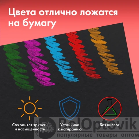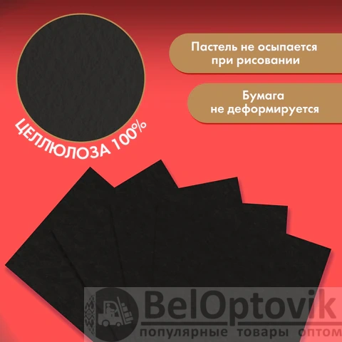 Окрашенная в массе бумага чёрного цвета высокой плотности 270 г/м2 гарантирует превосходное сохранение работ. Еще одним преимуществом является наличие рельефной фактуры, что немаловажно для создания рисунка пастелью. Бумага упакована в картонную папку с ярким рисунком. Папка позволит сохранить ваши рисунки во время транспортировки. В ней также удобно хранить готовые рисунки или наброски. Внутренний блок содержит 15 листов формата А3 (297х420 мм).