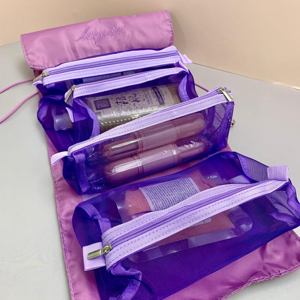 В органайзере находится сетчатых 4 кармана на молнии, которые позволяют удобно расположить все необходимые принадлежности. Отделения крепятся на липкую ленту и при необходимости могут быть перемещены или сняты для более удобной эксплуатации, а также могут использоваться как отдельные косметички. В собранном виде очень компактна. Зажимается шнурами фиксаторами на кулиске. Идеально подойдёт для путешествий и командировок!