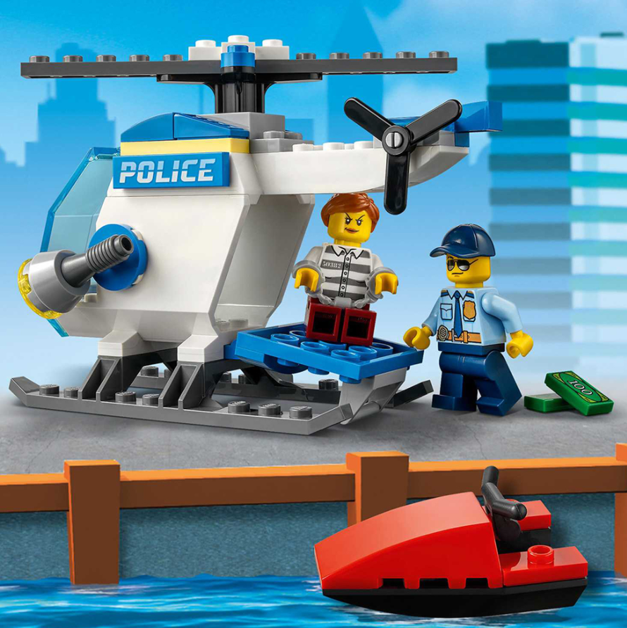 - У игрушечного полицейского вертолёта есть кабина для минифигурки, вращающиеся винты и фюзеляж, который открывается для пойманной воровки. Дети могут прикрепить воровку и краденые элементы с деньгами к скутеру.