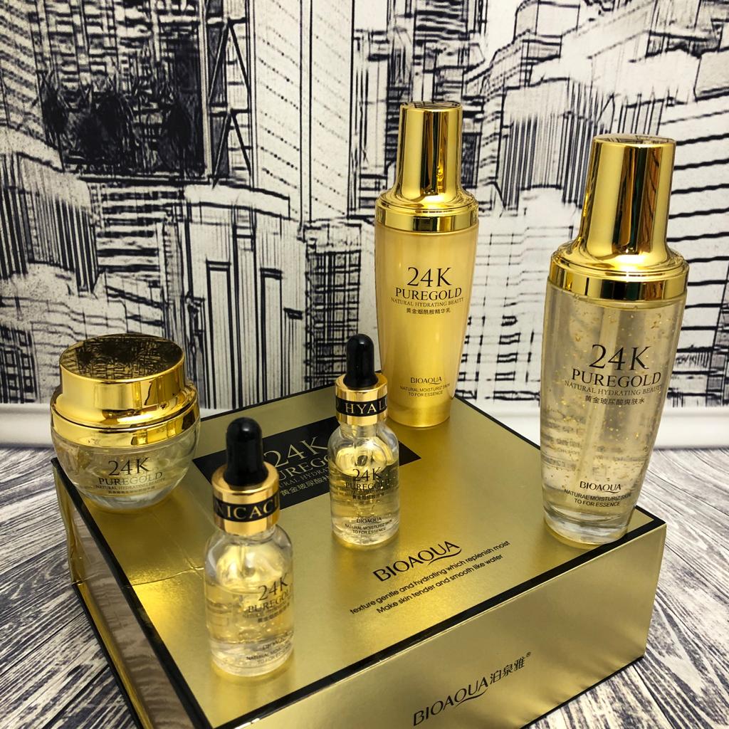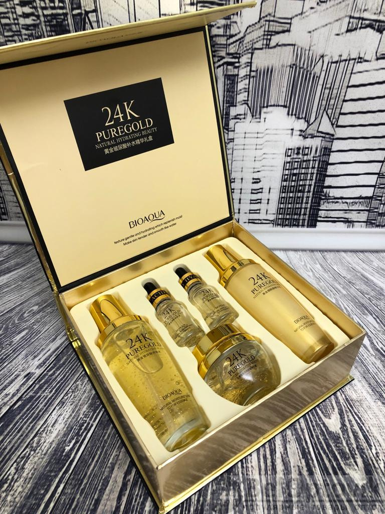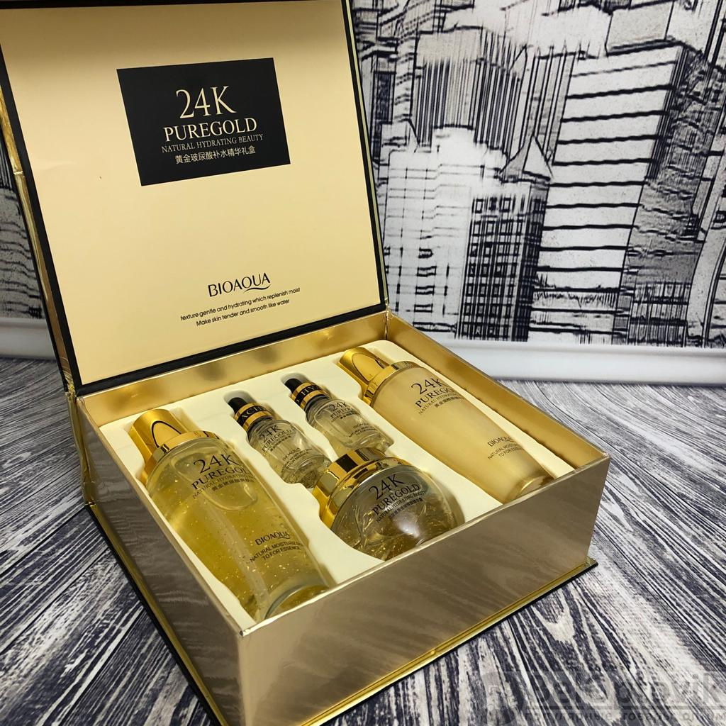 Что такое Подарочный набор уходовой косметики Bioaqua 24K Pure Gold Set с частицами золота и гиалуроновой кислотой (5 средств)